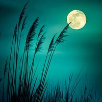 Een mystieke nachtelijke hemel ontvouwt zich, verlicht door een gloeiende maan die als een glinsterend oog over de zachte golven van grassen waakt. Hun ranke silhouetten dansen in de zachte bries en creëren een harmonieuze verbinding tussen aarde en lucht, terwijl de koele, blauwe atmosfeer een gevoel van kalmte en mysterie oproept.