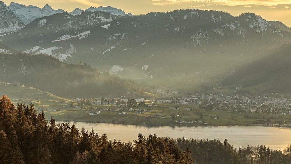 Avondstemming over de Sihlsee met Einsiedeln