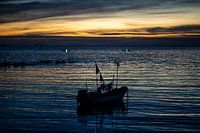 Twee vissersboten drijven rustig op het kalme water terwijl de zon langzaam ondergaat. De zachte kleuren van de schemering weerspiegelen op de golven, wat een vredige en meditatieve sfeer creëert. Een moment van stilte en eenvoud in de natuur.