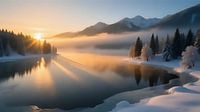De foto toont een winterlandschap in het diepst van de winter, vastgelegd op het moment van zonsondergang, en brengt een mengeling van strenge kou en stille warmte over. Brede vlaktes en glooiende heuvels liggen onder een dikke, ongerepte laag sneeuw, waarvan het oppervlak een matte glans en fijne windstructuren heeft; ijzige grassen en…