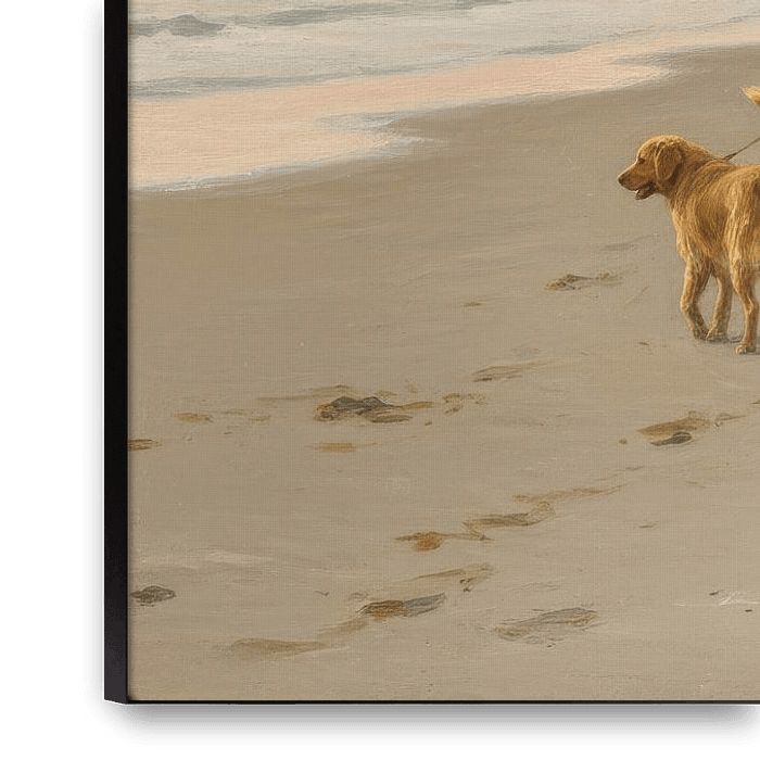 Een sfeervol schilderij uit de Victoriaanse periode toont drie figuren die bij zonsondergang een wandeling maken langs het strand, vergezeld door hun honden. De zachte pastelkleuren van de avondlucht, de ruisende zeegolven en de verstilde sfeer creëren een tijdloos beeld van ontspanning en grandeur. Het contrast tussen de formele…