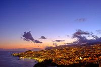 Avond uitzicht over Funchal, de hoofdstad van Madeira eiland Portugal tijdens een zomeravond met stadslichten en kleine bootjes die voor de nacht terugkeren naar de haven.