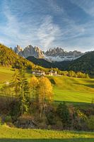 De late namiddagzon baadt het schilderachtige landschap van het Villnösstal in een warm licht. Op de achtergrond ziet u de Geisler pieken, die tot de beroemdste bergen van de Dolomieten behoren.