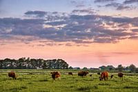 Een groepje koeien staat op een zomerse avond in de wei te grazen, onder een roze gekleurde avondlucht.