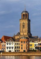 Deventer is een oude Hanzestad gelegen aan de IJssel rivier in Nederland. De stad heeft zo'n 100 000 inwoners en trekt jaarlijks ook veel toeristen. Een van de blikvangers van de stad is de toren van de Lebuinuskerk. Hij bepaalt de typische skyline van de stad. Hier zien we de toren over de IJssel rivier heen, in mooi gouden avondlicht.