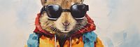 Avonturier - Het schilderij toont een dierlijk personage, mogelijk een konijn of een knaagdier, gestileerd in menselijke kleding met een zonnebril, wat een speelse en antropomorfe sfeer creëert. De stijl is expressief met duidelijke penseelstreken en een rijke textuur, waarbij levendige kleuren zoals geel, oranje, rood en blauw gebruikt zijn in het kledingstuk van het personage. Het geheel is speels en kleurrijk tegen een neutrale, lichtblauwe achtergrond.