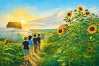 Dit werk is ontstaan vanuit een foto die ik zelf nam tijdens een wandeling in de tuin op een mooie zomeravond. Het oorspronkelijke beeld vormde het vertrekpunt voor een fantasierijke vertaling waarin ik bewust afstand nam van de fotografische realiteit om ruimte te maken voor sfeer en verbeelding.