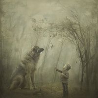 "Betreed de betoverende wereld waar de charme van vervlogen dagen herleeft in een ontroerend tafereel van kind en hond. Dit prachtige werk, gekenmerkt door een vintage esthetiek, vangt het tijdloze bondgenootschap tussen een jong kind en zijn trouwe metgezel in een enkel beeld. De warme tinten en verweerde texturen weerspiegelen de nostalgie van lang vervlogen tijden, terwijl de speelse interactie tussen het kind en de hond een gevoel van opwinding en verwondering oproept. Elk penseelstreek roept herinneringen op aan een tijd waarin avonturen werden beleefd zonder digitale afleidingen, waar vriendschap de tand des tijds doorstond.