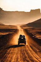 Een eindeloos, stoffig pad strekt zich uit in de gouden schemering, terwijl een robuust voertuig, beladen met avontuur, door het ongerepte landschap glijdt. Omringd door majestueuze bergformaties en het zachte spel van licht en schaduw kondigt deze scène het vertrek naar onbekende vlakten aan - een vertrek naar het onbekende.