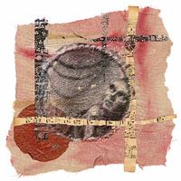collage van decoratieve motieven en afbeeldingen afgedrukt op deli paper, op stof geplakt met gekleurd vloeipapier, stroken bladmuziek, borduurgaren en versiersels