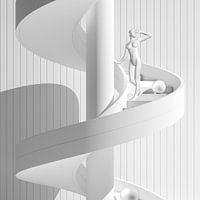 Surrealistisch beeld in wit grijs tinten met een naakte vrouw die ontwaakt en een wenteltrap afloopt in een futuristische wereld.