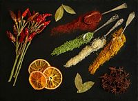 Kleurrijk stilleven met specerijen op zwart stenen ondergrond .