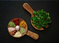 Cheerful still-life with spices on wooden spoons on black stone background.