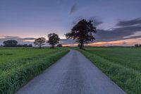 De polder nabij Nunspeet (Gelderland, Nederland), gefotografeerd na zonsondergang. Het laatste licht staat nog aan de hemel, terwijl de duidsternis intreedt. De weg zorg in deze landschapsfoto voor de dieptewerking, versterkt door de verhoudingen van de bomen.