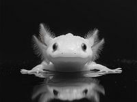 In deze zwart-wit foto ligt een axolotl stil in het water, zijn frêle kieuwen als zachte waaiers uitgestrekt. Tegen de diepzwarte achtergrond lijken zijn gladde huid en nieuwsgierige blik haast buitenaards. Elk detail, van vin tot poot, is helder omlijnd. Het beeld straalt verstilling, kwetsbaarheid en mysterieuze schoonheid uit.