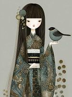 Illustratie portret in voornamelijk grijs en groen tinten van een lief klein Japans meisje in kimono met een vogel in haar hand.