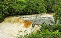 Die Aysgarth Falls im Wensleydale sind dreiteilig, hier sieht man die mittleren Wasserfälle. Wasserfall in den Yorkshire Dales, England, Großbritannien. Sommer 2014.