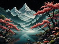 Een artistieke afbeelding van een vredig Aziatisch tafereel.