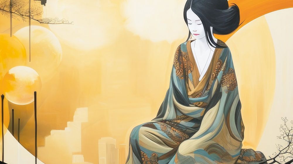 Modern semi-abstract schilderij van een meditatie landschap bij zonsondergang. Een vrouw zit in het natuurlijke landschap en heeft zich afgezonderd van de drukte van de dag. Het werk straalt rust uit.