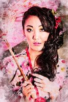 Digitaal mixed media kunstwerk van een Aziatisch model met een roze paraplu.
