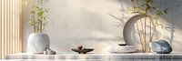 Een eigentijds Aziatisch stilleven, gekenmerkt door minimalistische esthetiek en zuivere witte tinten. Dit moderne kunstwerk straalt rust en eenvoud uit, met subtiele Aziatische elementen die subtiel zijn verweven in de compositie. De witte achtergrond vormt een perfect canvas voor de zorgvuldig gearrangeerde objecten, die symbool staan voor evenwicht en harmonie. Elk element ademt een gevoel van ingetogen elegantie, waardoor het stilleven een tijdloze en serene sfeer uitstraalt.