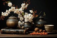 In elk werk komt de perfectie van de geselecteerde elementen naar voren, met een scherp oog voor detail en een diepgaand begrip van de subtiele nuances van de Aziatische kunstgeschiedenis. De harmonie tussen de verschillende objecten in deze stillevens weerspiegelt niet alleen vakmanschap, maar ook een diep respect voor de symboliek die inherent is aan deze cultuur. De kunstmatige intelligentie lijkt een ongelooflijke partner te zijn geweest in het interpreteren en reproduceren van deze symboliek, waardoor deze kunstwerken een authentieke en toch eigentijdse flair krijgen.