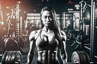 Dit indrukwekkende beeld toont een gespierde Aziatische vrouw met lang haar die vastberaden en krachtig een zware halter in haar handen houdt. Ze is in een sportschool en is bezig met het trainen van haar fysieke kracht.