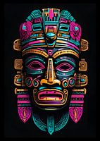 Een levendig, gestileerd Azteeks masker is afgebeeld tegen een zwarte achtergrond. Het masker is versierd met ingewikkelde geometrische patronen in gouden, turquoise, roze en zwarte tinten. Het masker heeft een prominente neus, wijde ogen en een open mond, wat duidt op een krachtige en spirituele aanwezigheid. Het gedetailleerde snijwerk en de felle kleuren creëren een gevoel van oud ritueel en culturele betekenis.