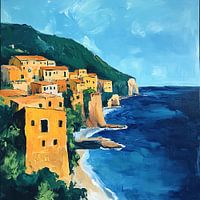 Details: Mediterrane kustlijn, kustlandschap, schilderij kust, zeegezicht, kliffen, architectuur, vakantiebestemming, artistieke interpretatie,…