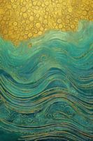 Dit werk toont een betoverende combinatie van gouden bubbels die lijken te dansen boven een golvende zee van blauwtinten. De zachte kronkels van de golven contrasteren prachtig met de geometrische perfectie van de gouden cirkels, wat een gevoel van harmonie en balans creëert. De verschillende tinten groen en blauw in de zee brengen een kalmerende sfeer, terwijl de gouden bubbels een vleugje warmte toevoegen. Dit werk is perfect voor moderne interieurs en brengt een gevoel van rust en verfijning in elke ruimte.