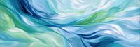 Zachte golven in tinten azuur, smaragd en wit verenigen zich in een vloeiende dans van kleur. Elke penseelachtige streek wekt een gevoel van beweging en rust tegelijk, met een subtiele diepte die uitnodigt tot verdwalen in het abstracte landschap.