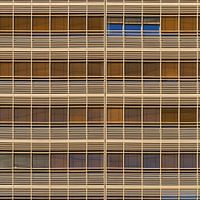 Foto van een moderne huisgevel in Berlijn, Duitsland. De ramen van deze glazen gevel aan de Potsdamer Platz zijn allemaal nog verduisterd. Echter, de blinden zijn al verhoogd op een van hen, dat is het begin...
