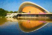 Foto van het Huis van de Wereldculturen in Berlijn, Duitsland. De opname van een van de bezienswaardigheden van de stad met de prachtige weerspiegeling in het water kreeg een schilderachtig effect door middel van beeldbewerking.