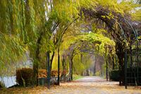 Fotografie aan de Lietzensee in Berlijn, Duitsland. De foto van de herfstbomen werd nagebootst door beeldbewerking van olieverfschilderijen, op deze manier kon een schilderachtig effect worden bereikt.