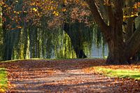 Fotografie aan de Lietzensee in Berlijn, Duitsland. De bomen gloeien in prachtige herfstkleuren in de late zon.