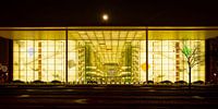 De regeringswijk van Berlijn met het Paul Löbe Huis bij nacht, Duitsland. De nachtopname toont de glazen gevel van het Paul Löbe Huis met de maan boven het gebouw.