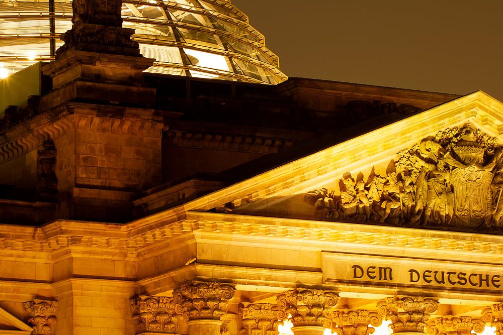 De regeringswijk van Berlijn met het Reichstaggebouw bij nacht, Duitsland. Een van de bezienswaardigheden van de stad als nachtopname.