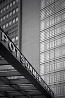 De Potsdamer Platz is een verkeersknooppunt in de Berlijnse districten Mitte en Tiergarten. Hier ziet u het bord van de zuidelijke spoorwegingang. Op de achtergrond de voorgevel van een van de vele hoogbouw. Monochroom stadsgezicht van het nieuwe hart van Berlijn.