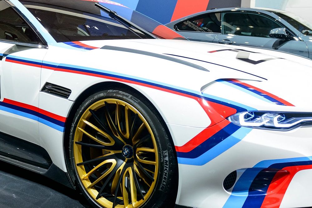 BMW 3.0 CSL Hommage R concept car. De BMW 3.0 Hommage R is een eerbetoon aan de klassieke 3.0 CSL lichtgewicht racewagen en is uitgerust met een zescilinder lijnmotor met een eBoost hybride systeem en een minimaal lichtgewicht interieur.
