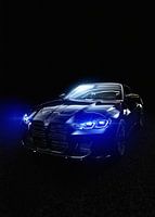 Een krachtige zwarte BMW M4 zit in totale duisternis. Zijn iconische nierengrille en intens blauwe LED koplampen doorboren de leegte en geven de auto een intimiderende en gerichte aanwezigheid.