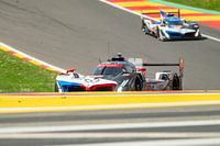 BMW M Team WRT #20 BMW M Hybrid V8 Hypercar gaat Raidilion op, bestuurd door Sheldon van der Linde, Robin Frijns, Rene Rast met de #15 BMW op de achtergrond tijdens de 2024 TotalEnergies 6 Uur van Spa-Francorchamps - FIA WEC-race op Circuit de Spa-Francorchamps. De tweede BMW M Hybrid V8 Hypercar volgt Eau Rouge op de achtergrond.