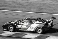 BMW M1 Procar klassieke racewagen rijdt hard op het circuit van Spa Francorchamps. De BMW M1 E26 was de eerste auto die werd ontwikkeld door BMW Motorsport GmbH en werd van 1978 tot 1981 geproduceerd als homologatieauto in samenwerking met Lamborghini. Zwart-wit foto.