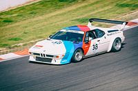 BMW M1 klassieke racewagen rijdt door een bocht op het circuit van Spa Francorchamps. De BMW M1 E26 was de eerste auto die door BMW Motorsport GmbH werd ontwikkeld en werd in samenwerking met Lamborghini van 1978 tot 1981 geproduceerd als homologatiewagen. Foto met een vintage look.