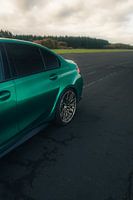 Met een donker wegdek heeft de foto een koudere uitstraling wat door mooi in balans wordt gebracht door de groene bomen en vooral de groene BMW M3.