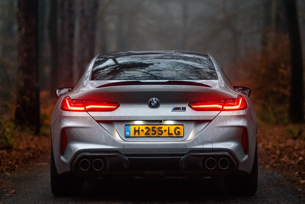 De prachtige BMW M8 Competition Gran Coupé in de BMW Individual kleur 'Liquid Metal Silver' in het bos.