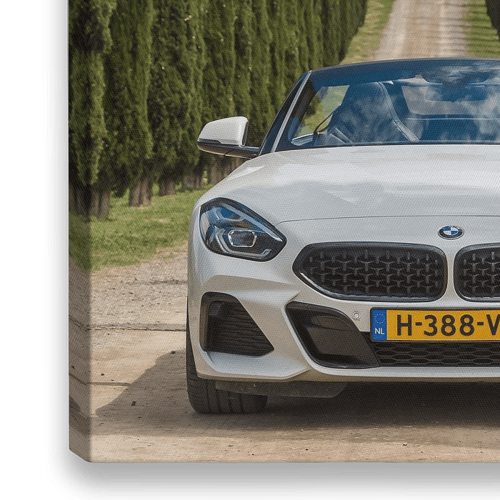 Een foto van een BMW Z4 staand tussen in cipressenlaan in de regio Toscane in Italie. De ideale auto om in het mooie en zonnige Toscane te verkennen.