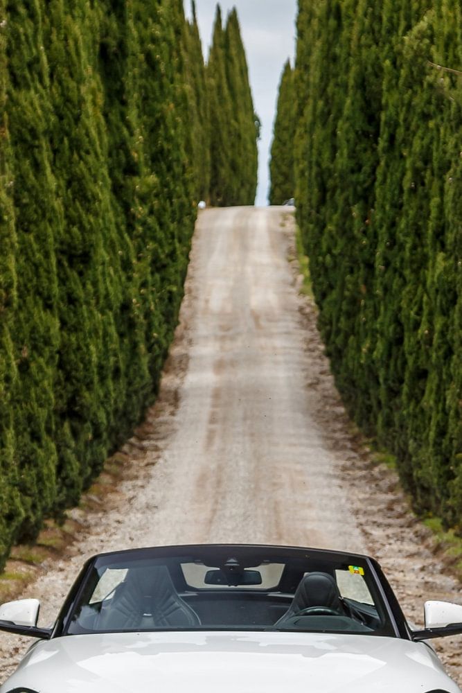 Een foto van een BMW Z4 staand tussen in cipressenlaan in de regio Toscane in Italie. De ideale auto om in het mooie en zonnige Toscane te verkennen.