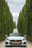 Een foto van een BMW Z4 staand tussen in cipressenlaan in de regio Toscane in Italie. De ideale auto om in het mooie en zonnige Toscane te verkennen.