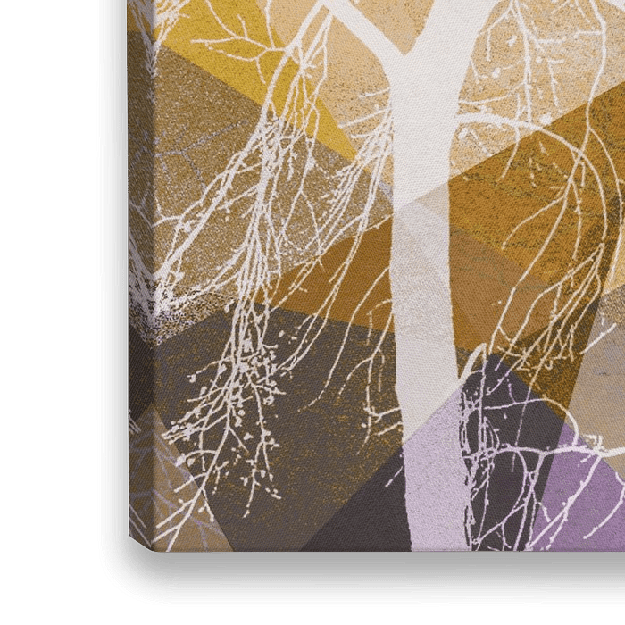 BOOMSHILOUETTES IN GEOMETRISCH FANTASIELANDSCHAP.