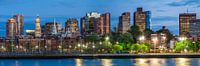 Een betoverend uitzicht op Boston op het blauwe uur - de verlichte skyline van North End met de Custom House Tower en de top van de Old North Church. De twee historische gebouwen vallen op voor de moderne wolkenkrabberskyline. Indrukwekkende avondsfeer uit de hoofdstad van Massachusetts.